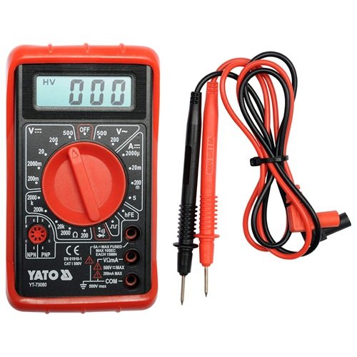 Free Shipping Above Rs. 2000/-Compact digital multimeter for electrical and automotive use with a clear LCD display and versatile measurement functions including AC/DC voltage, current, resistance, continuity, diode and transistor tests. Easy-to-use handheld design with 9 V battery power and protective rubber casing for durability.